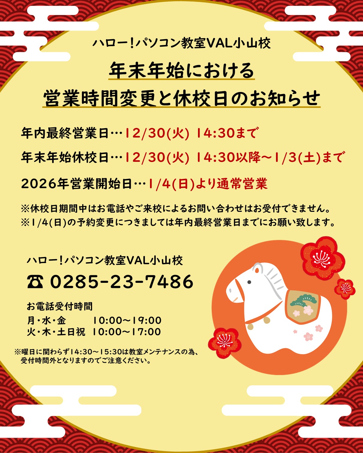年内最終営業日は12/30(火) 14:30まで、12/30(火) 14:30以降~1/3(土)は休校とさせていただきます。